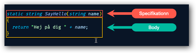 - En kropp(även kallat body eller implementering). Som beskriver vad metoden utför.
