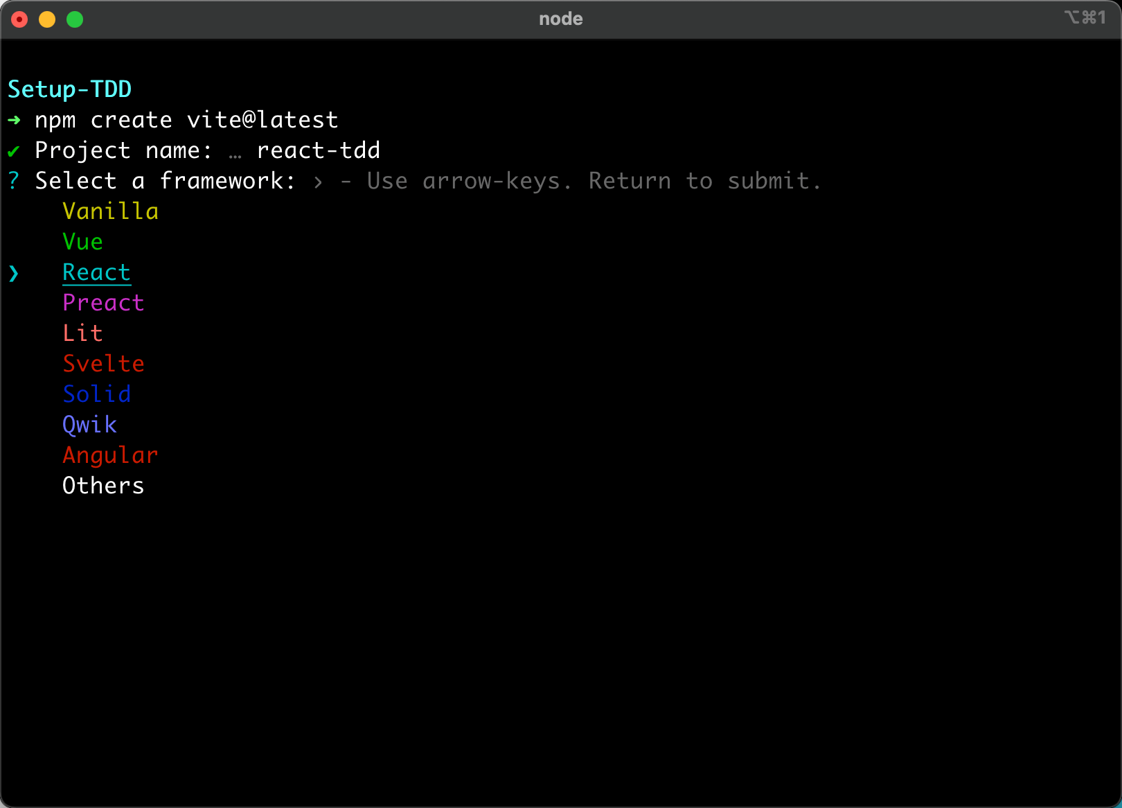 Nästa fråga är vilket ramverk som ska användas. Använd piltangent för att flytta ner till React, tryck Enter.