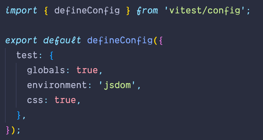 Sist men inte minst behöver vi lägga till en konfigurationsfil för vitest i roten på vårt projekt. Skapa filen vitest.config.ts i roten på projektet. Lägg till följande kod i filen.