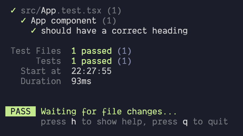 Förutom vitest behöver installera ett paket som hjälper oss att skriva tester för React och dess tsx komponenter. Paketet som vi behöver är Testing Library för React. Så i terminal fönstret skriver vi nu in följande kommando:npm i –D @testing-library/react @testing-library/dom